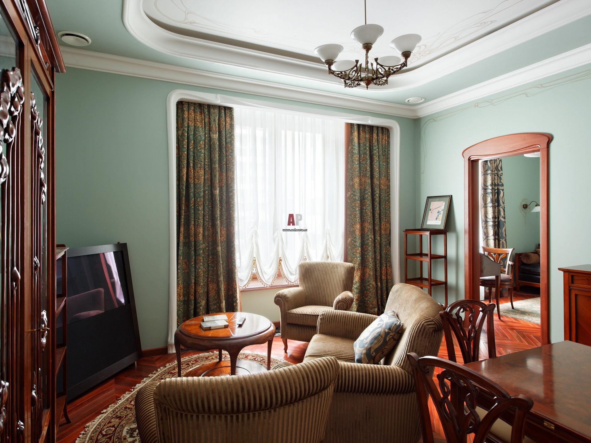 Декоративное обрамление окна рифмуется с отделкой потолка. Лепные рамы имеют обтекаемые формы и выполнены в стилистике ар-нуво.