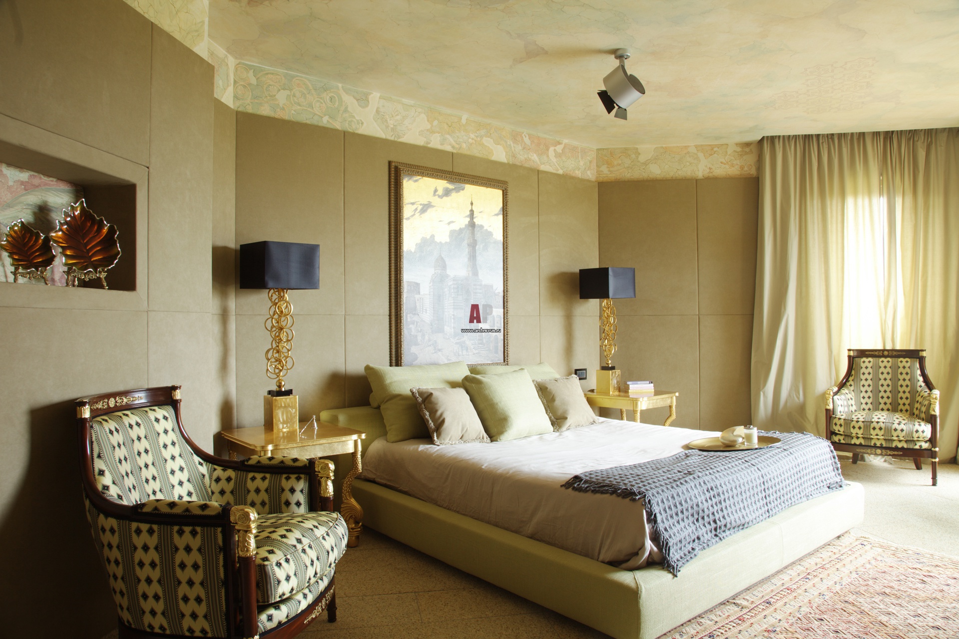 Стены спальни зашиты тканевыми панелями. Потолки и карнизы крашены росписью. Над кроватью – картина с изображение Флоренции. Неоклассические прикроватные тумбы, кресла, Angelo Cappellini.