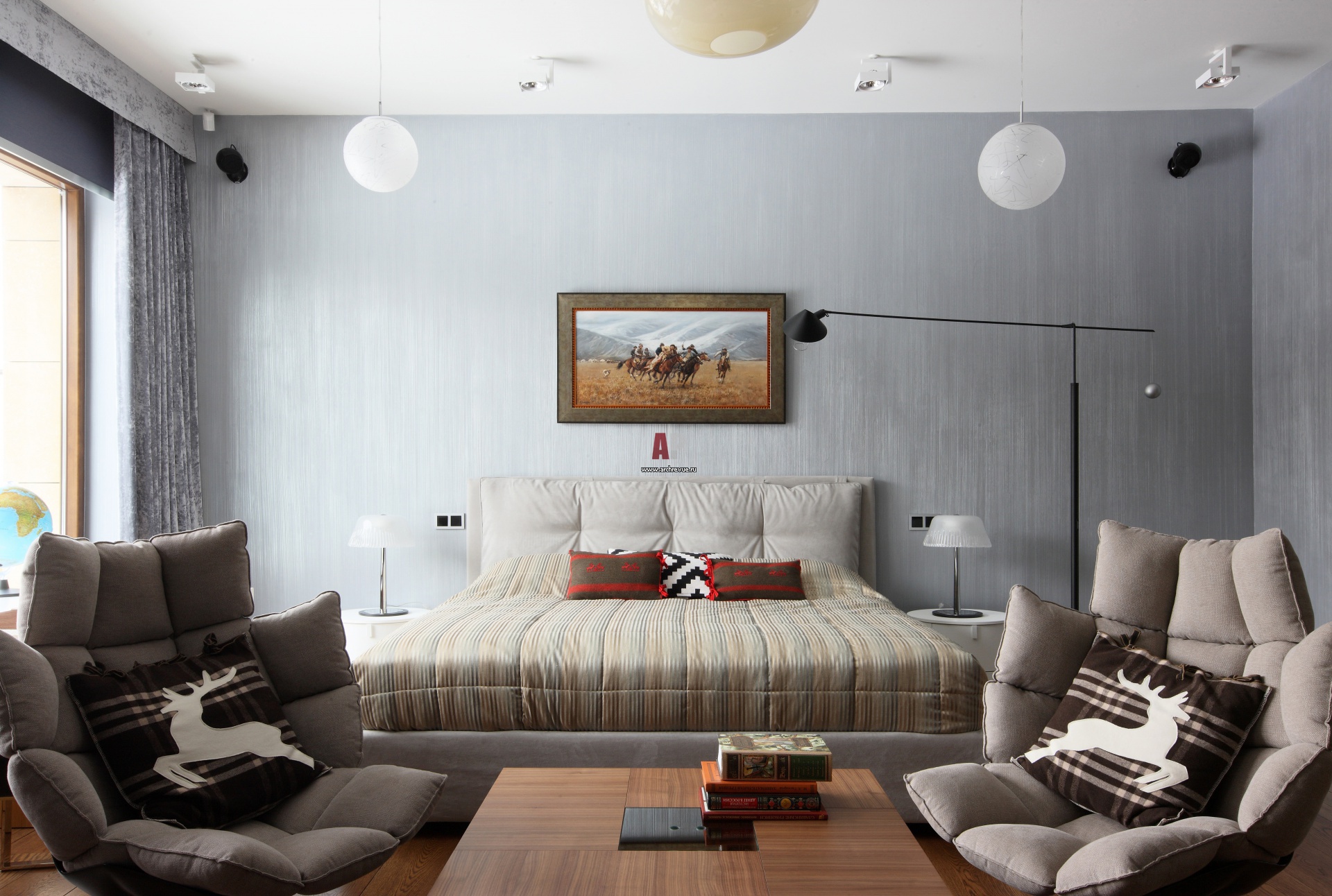 Фото интерьера спальни в современном стиле. Стены оформлены декоративными штукатурками с эффектом стекающей воды.