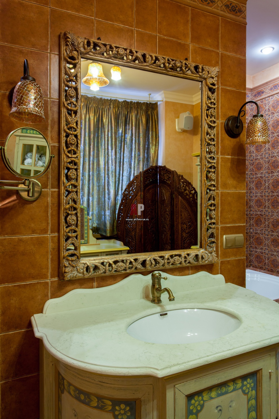 Фото интерьера ванной комнаты в классическом английском стиле. Мойдодыр сделан из патинированного дерева с росписью. Бронзовые краны.