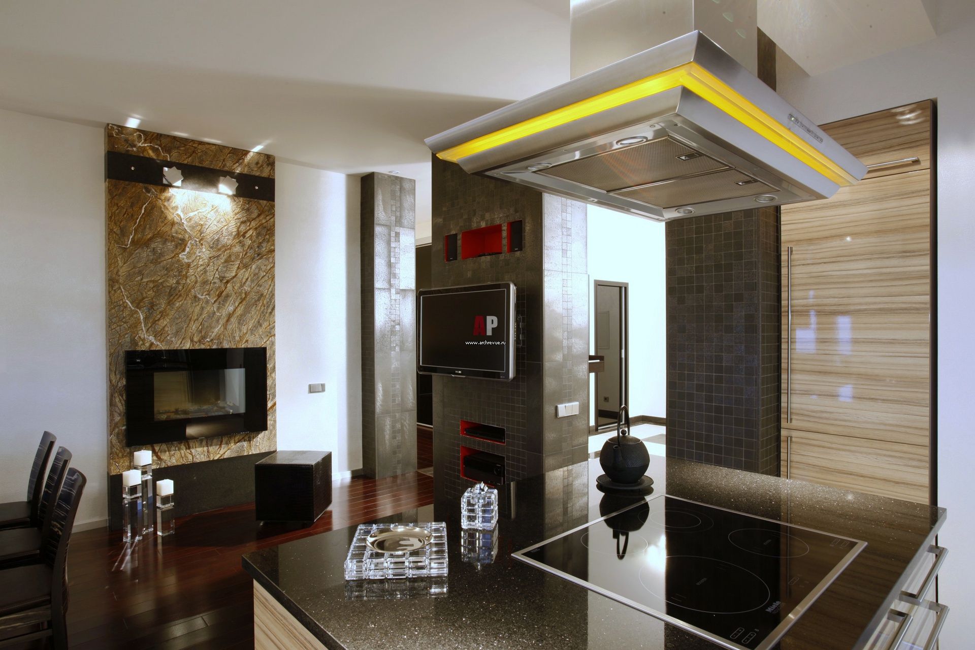 Вид со стороны кухонного острова на камин. Камин облицован несколькими материалами: мрамором с необработанной фактурой, основание камина выделено гранитом.
