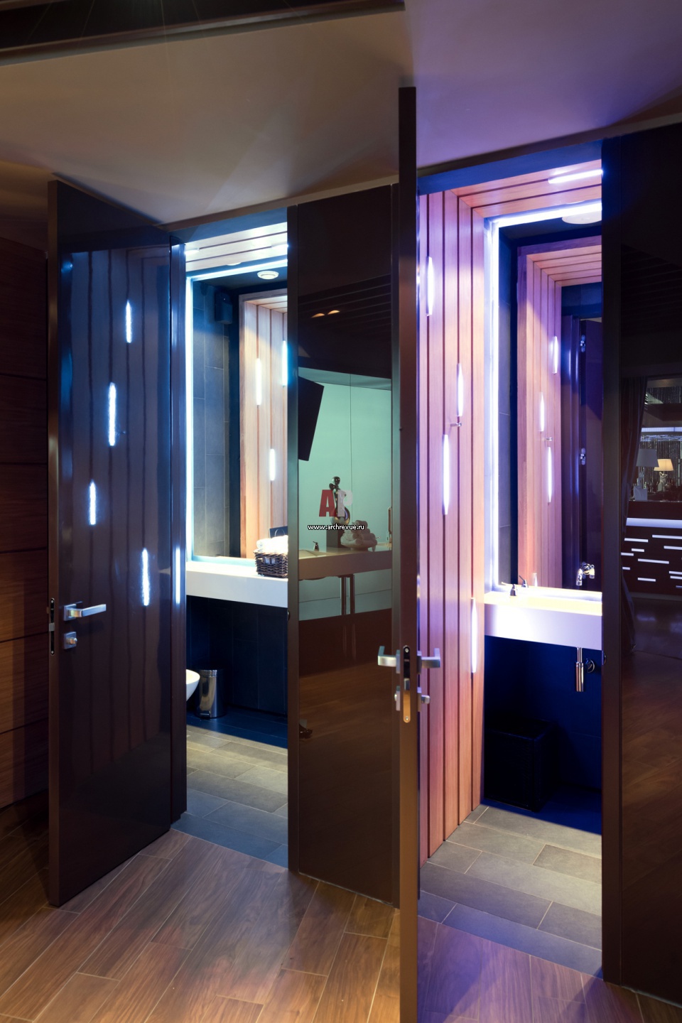 Туалетные комнаты в современном ресторане. Двери и стены в туалетных комнатах зашиты узкими деревянными панелями, между досками вмонтированы вертикальные светильники.