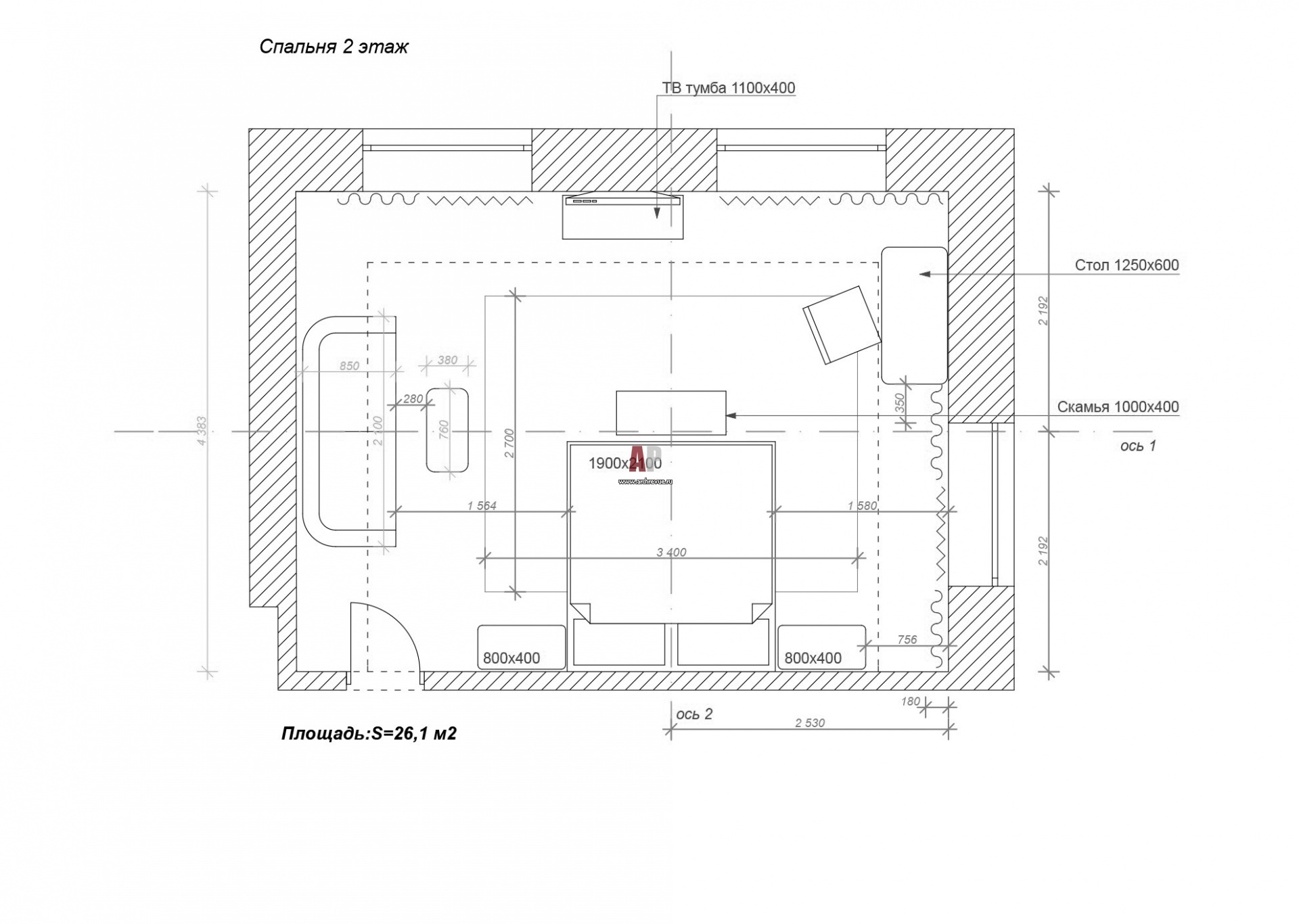 Планировка спальни на 2-м этаже 2-х этажного дома.