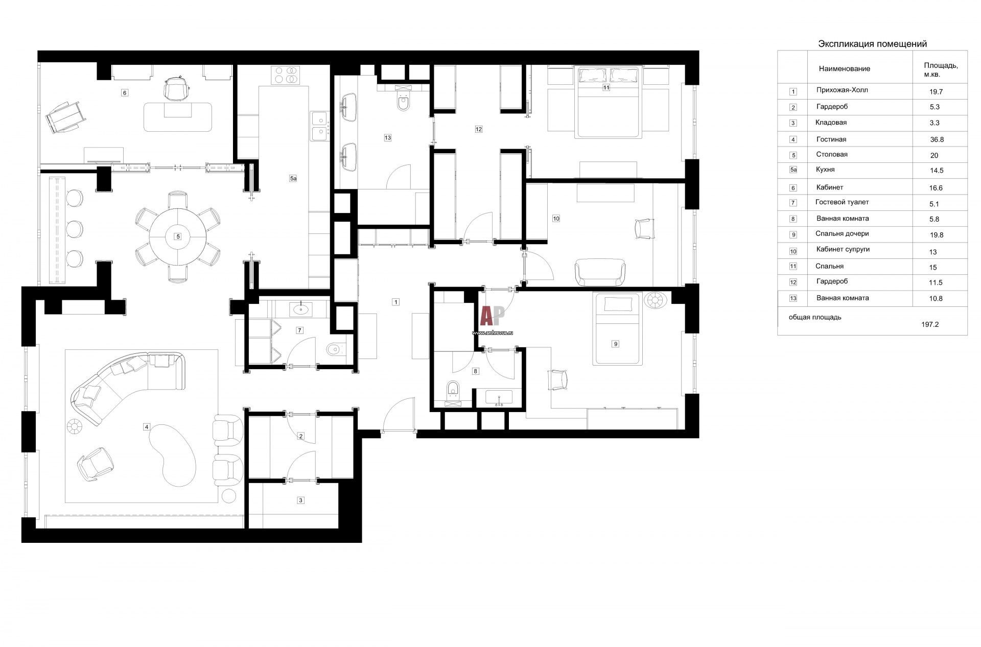 План объединения двух квартир. Общая площадь – 200 кв. м.