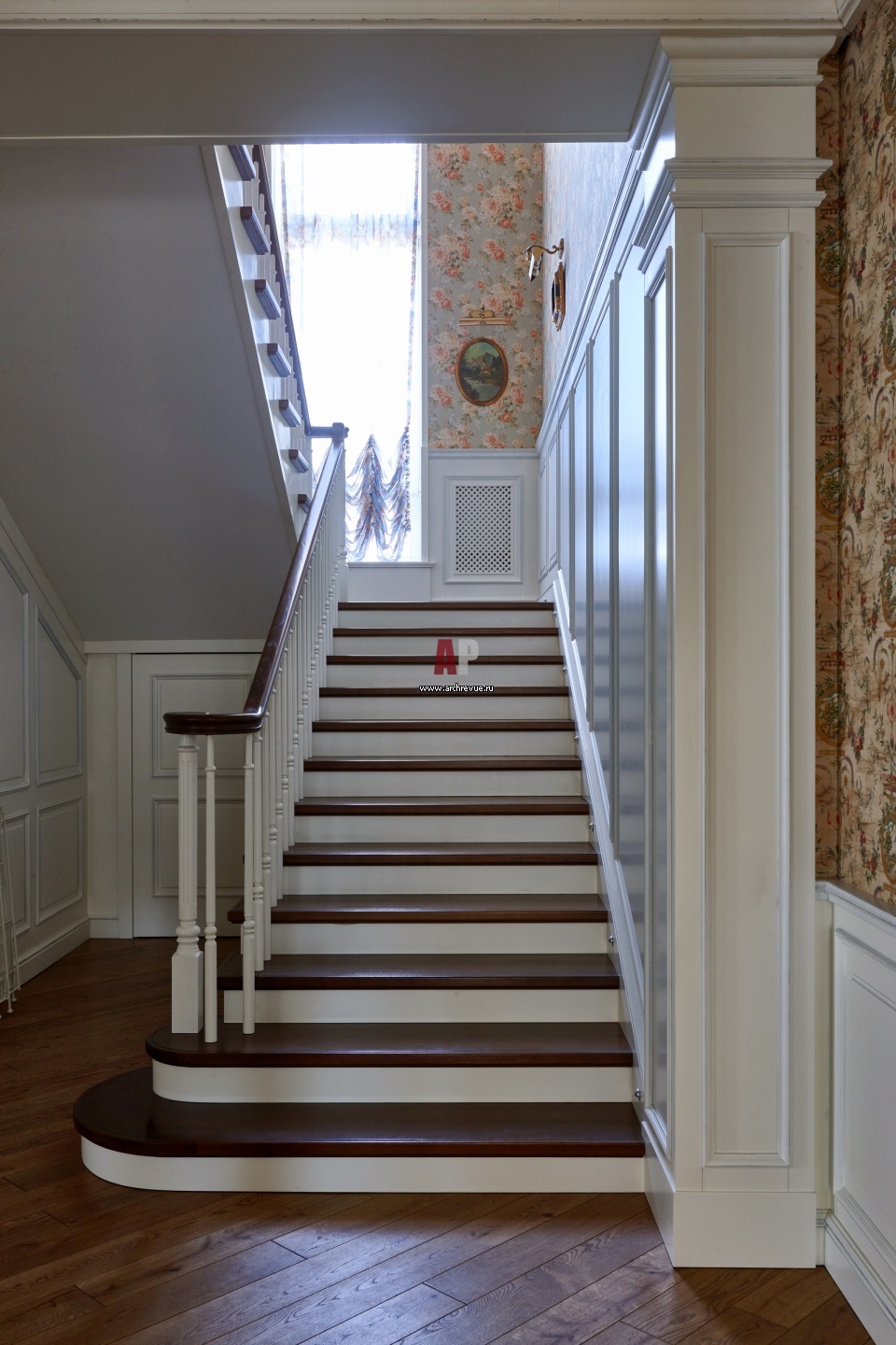 Семейный дом в Подмосковье. Интерьер лестничного холла в стиле современная классика. С белым ограждением лестницы контрастируют ступени из темного дуба.