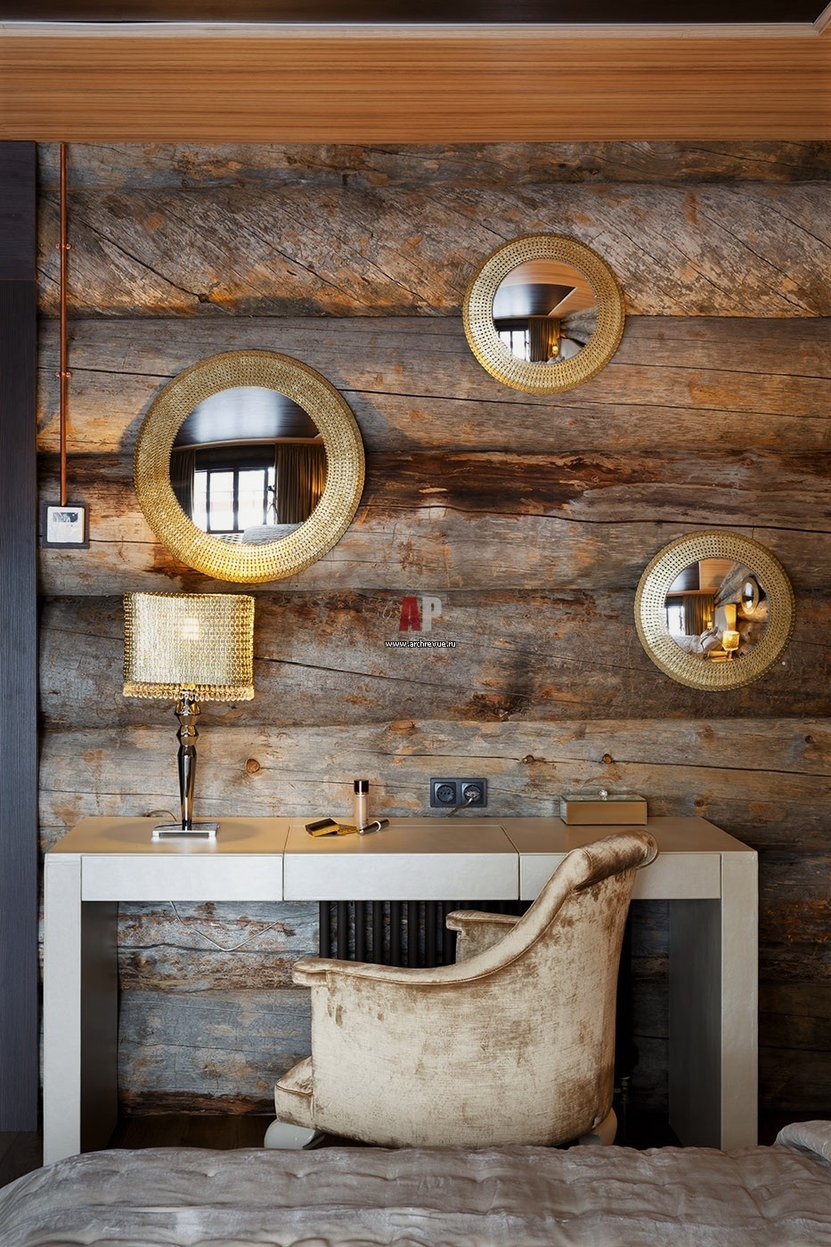 Дом из бревна кело большого диаметра. Интерьер женской спальни.