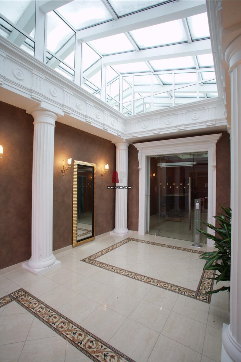 Интерьер холла – эклектичное сочетание современных конструкций светового фонаря и классических элементов: колонн, мозаичного ковра, лепнины, поставщик «Департа».
