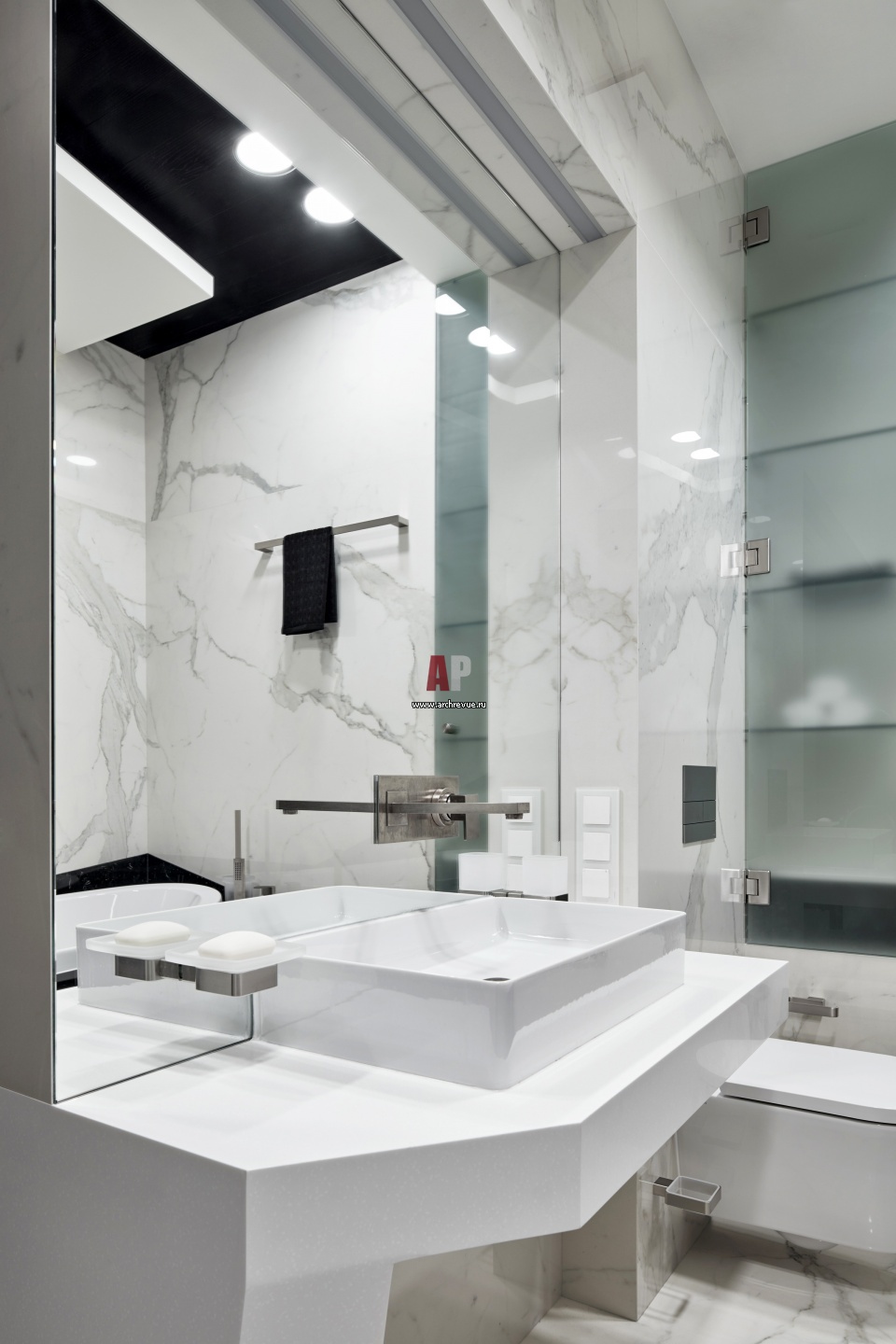 Квартира в высотке на Мосфильмовской. Интерьер санузла. Столешница умывальника имеет ломаную форму, она выполнена из кориана.