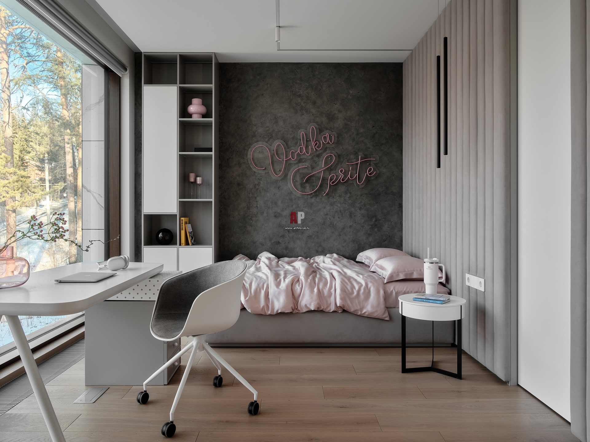 Комната дочери выполнена в холодных серых оттенках с вкраплениями ярких цветовых пятен – желтого и ярко-розового. Стена за изголовьем зашита мягкими панели с вертикальным декором. Фронтальная стена отделана графитово-серой декоративной штукатуркой с брутальным эффектом.