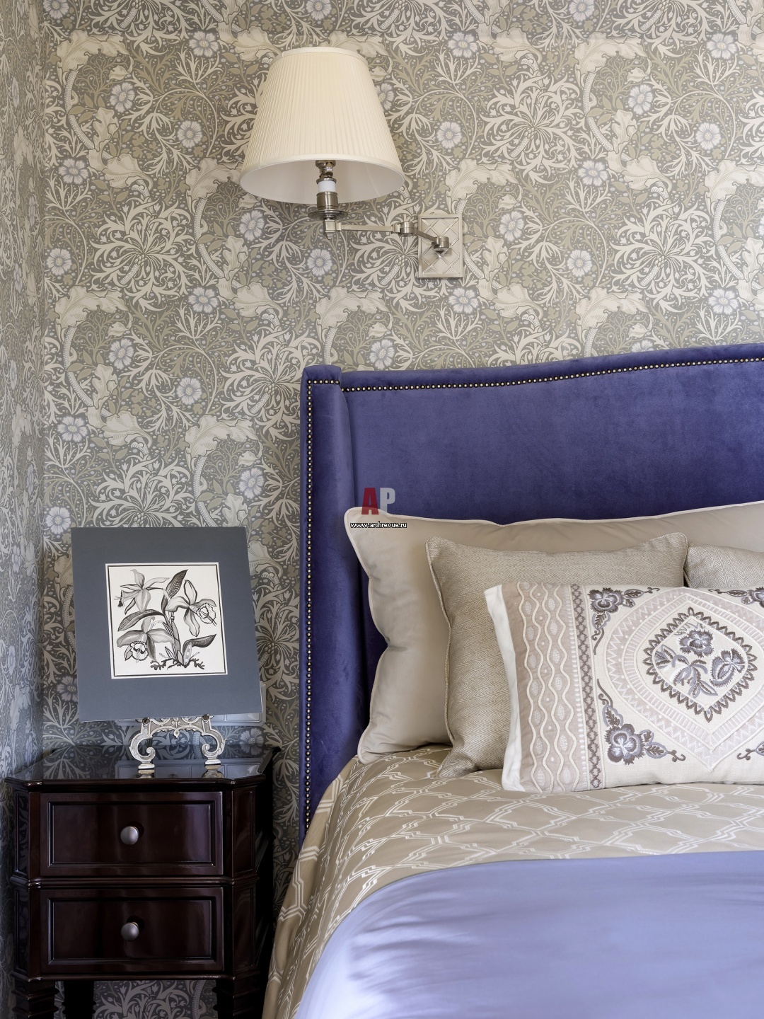 Камерный особняк в английской классике. Интерьер хозяйской спальни оформлен в светлых оттенках серого, бежевого и лаванды.