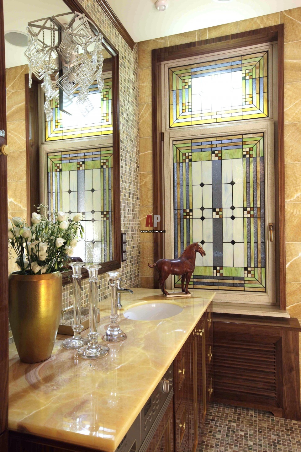 Интерьер ванной комнаты с витражом с элементами стиля ар-нуво. Пол и стена за зеркалом оформлены каменной мозаикой. Столешница умывальника, а также обрамление окна с витражом – из слэбов оникса.