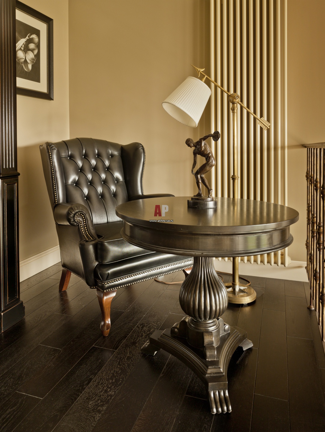 Зона отдыха в библиотеке расположенной в холе второго этажа. На полу – массивная доска из копченого ясеня. Черное кожаное кресло выглядит основательно.