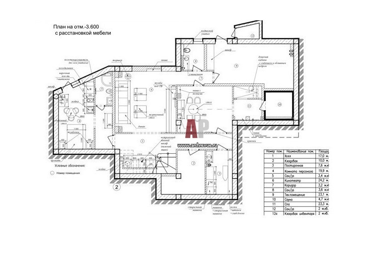 План цокольного этажа трехэтажного современного дома в Крыму. Общая площадь – 600 кв. м.