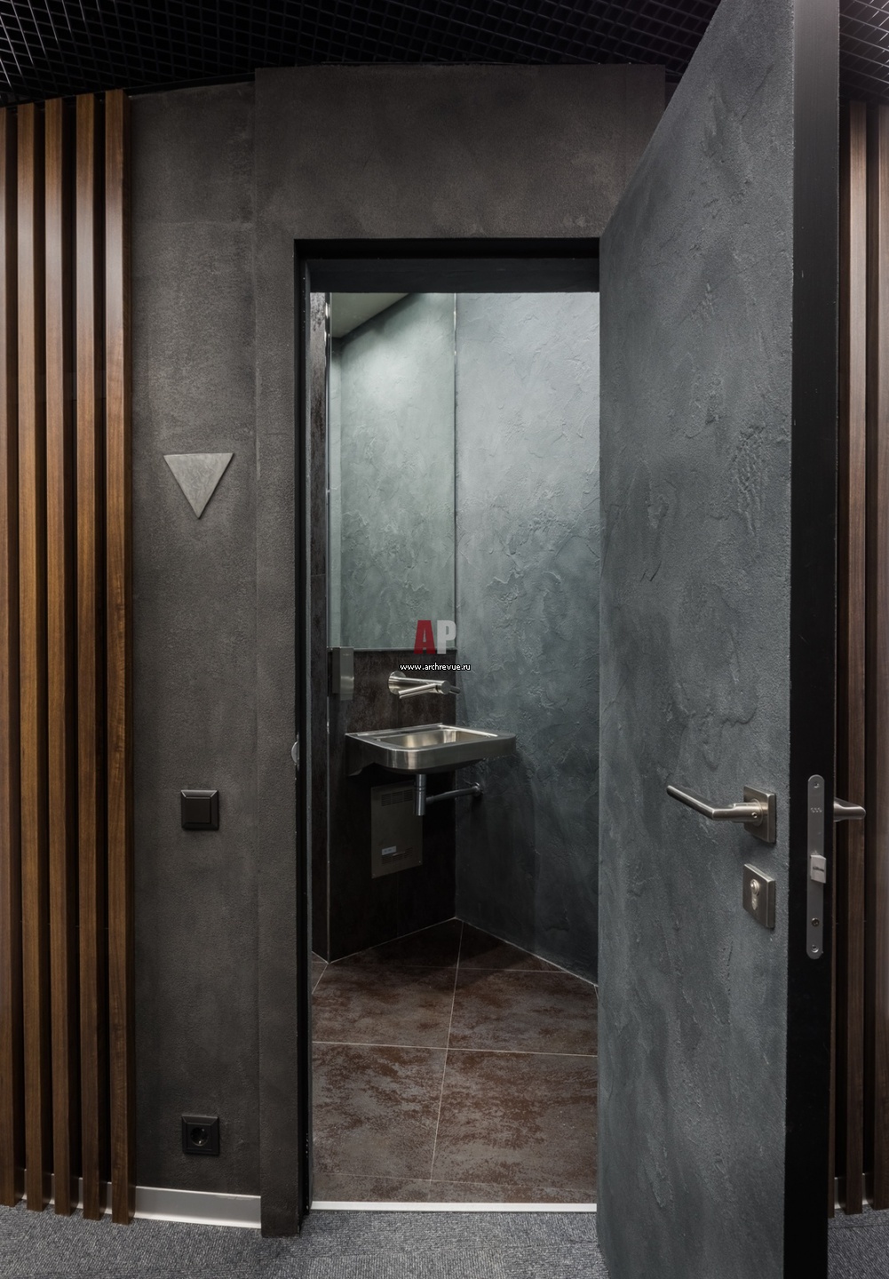 Мужской санузел оформлен брутально. Стены и дверь оформлены шершавой штукатуркой под бетон. Сантехника изготовлена из нержавейки, Nofer. Такую ставят в самолетах.
