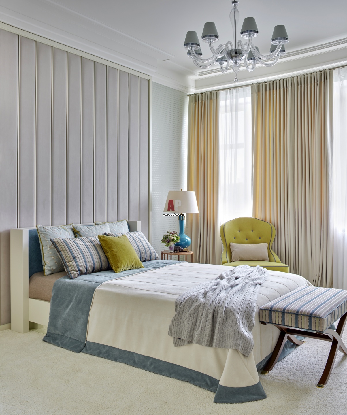 Стена за изголовьем кровати в детской комнате обита панелями из алькантары с вертикальным ритмом. Кресло, Brabbu.