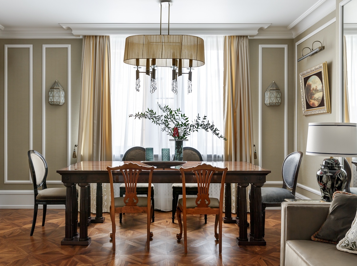 Интерьер столовой. Антикварные английские чиппендейловские стулья насыщенного рыжего цвета вдохновили на создание обеденного стола с элементами дорического ордерного декора. Настенные серебряные антикварные светильники, Иран, начало ХХ века.