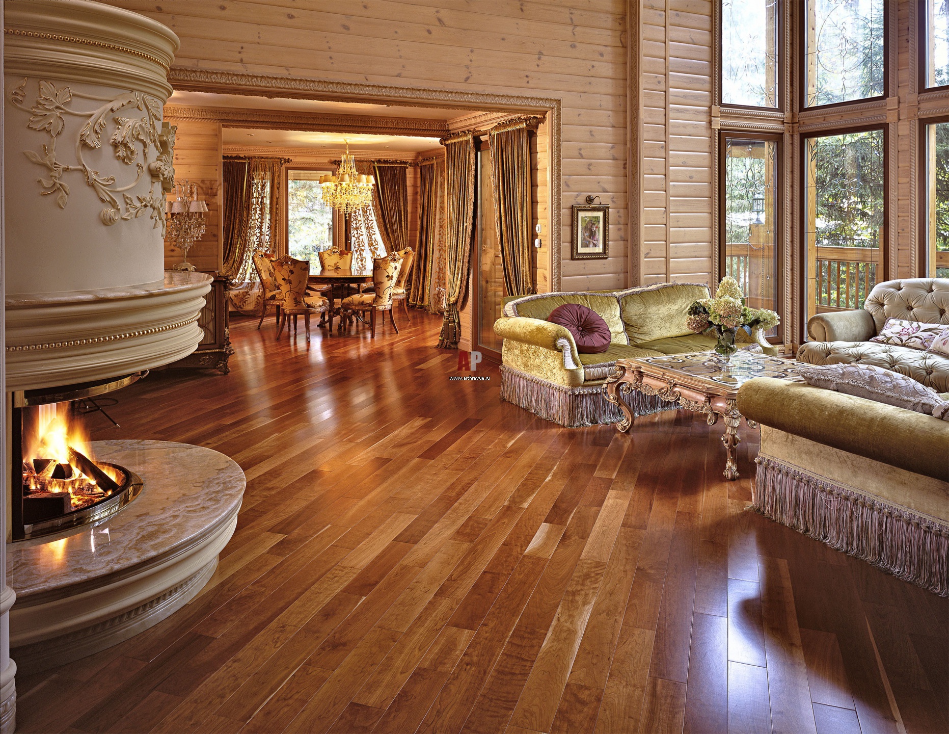 На полу центрального зала уложен паркет из вишни, уложен помпезно и широко – крупными досками, подчеркивающими красоту структуры древесины.