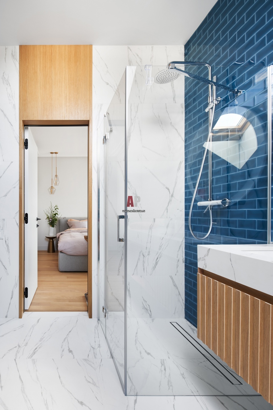 Ванная комната при хозяйской спальне. Высокие дверные порталы визуально увеличивают потолок мансарды.