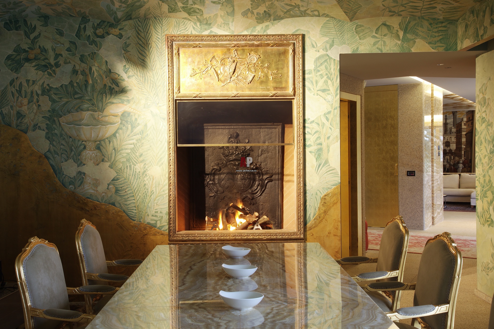 Камин с открытой дровяной топкой в столовой сделан на уровне стола. Задник камина – антикварная французская чугунная доска, которую архитекторы нашли на антикварном рынке в Париже. Двери в доме выкрашены в золотой цвет. Золочение – характерный приём для Ренессанса.