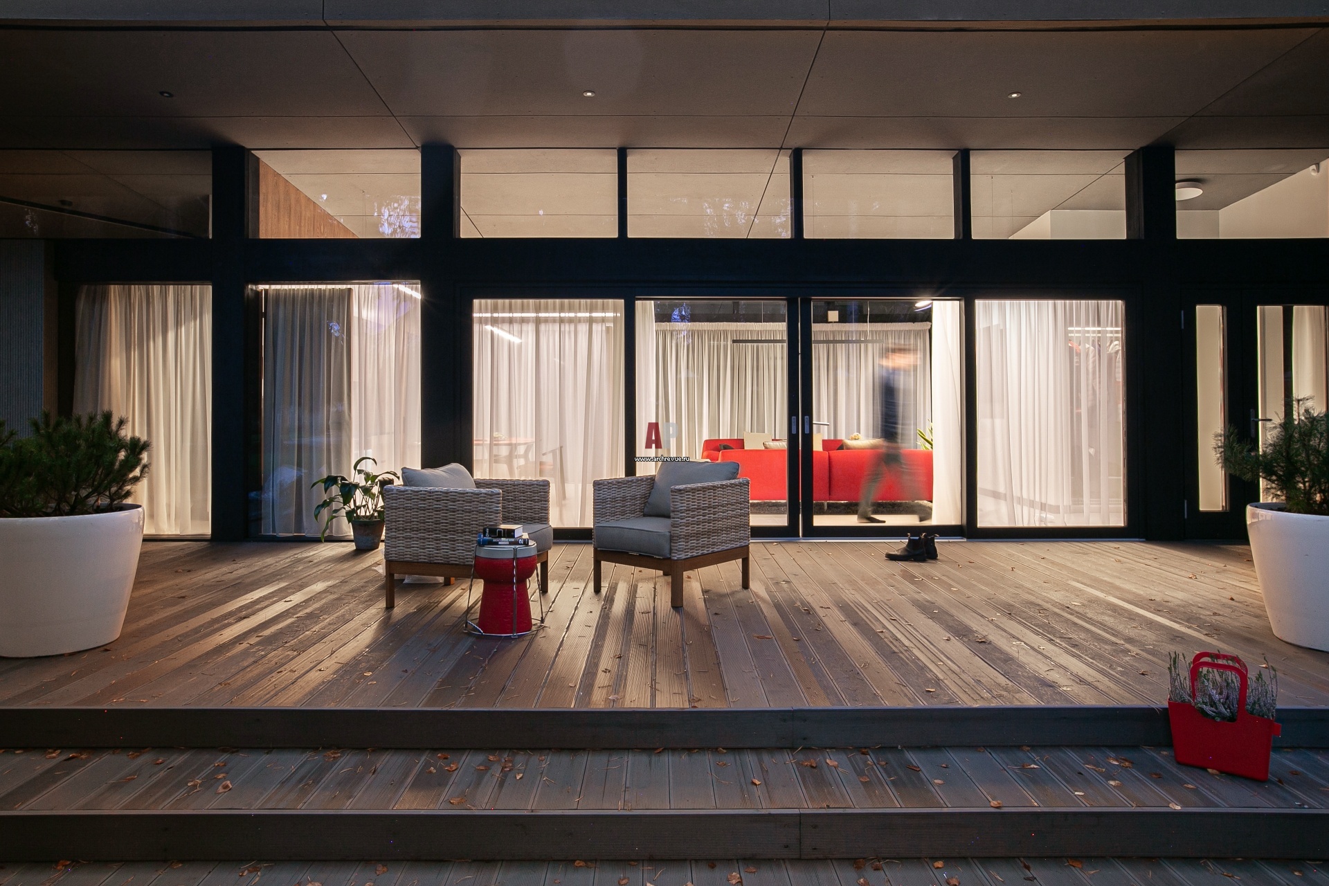 Центральный объем, в котором расположена гостиная, застеклен с обоих фасадов и открывает вид на лес. В теплое время года окна можно полностью открыть, и тогда интерьер сливается с экстерьером. Диваны, Bonaldo.