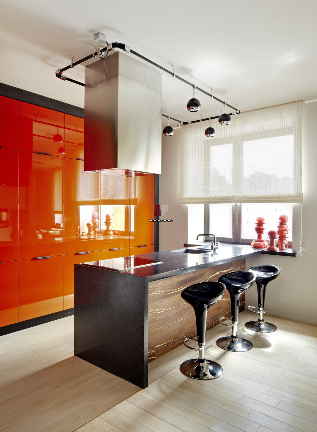 Кухня Cesar с глянцевыми фасадами оранжевого цвета. Кухонный остров декорирован дубовыми досками Mafi с эффектом «белых прожилок».