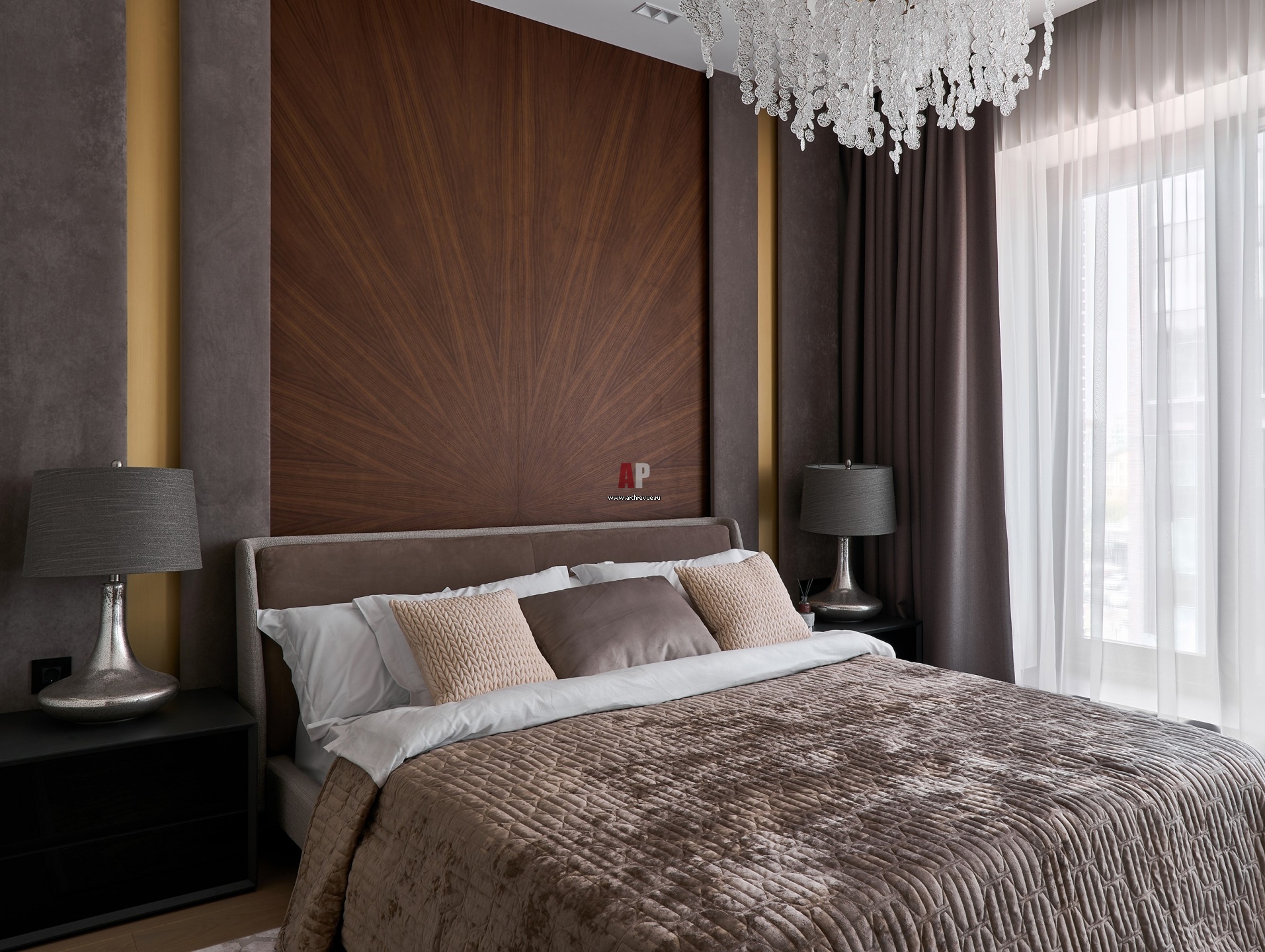 Гостевая спальня. Изголовье выделено шпонированным панно с активным рисунком в обрамлении из мягких панелей.