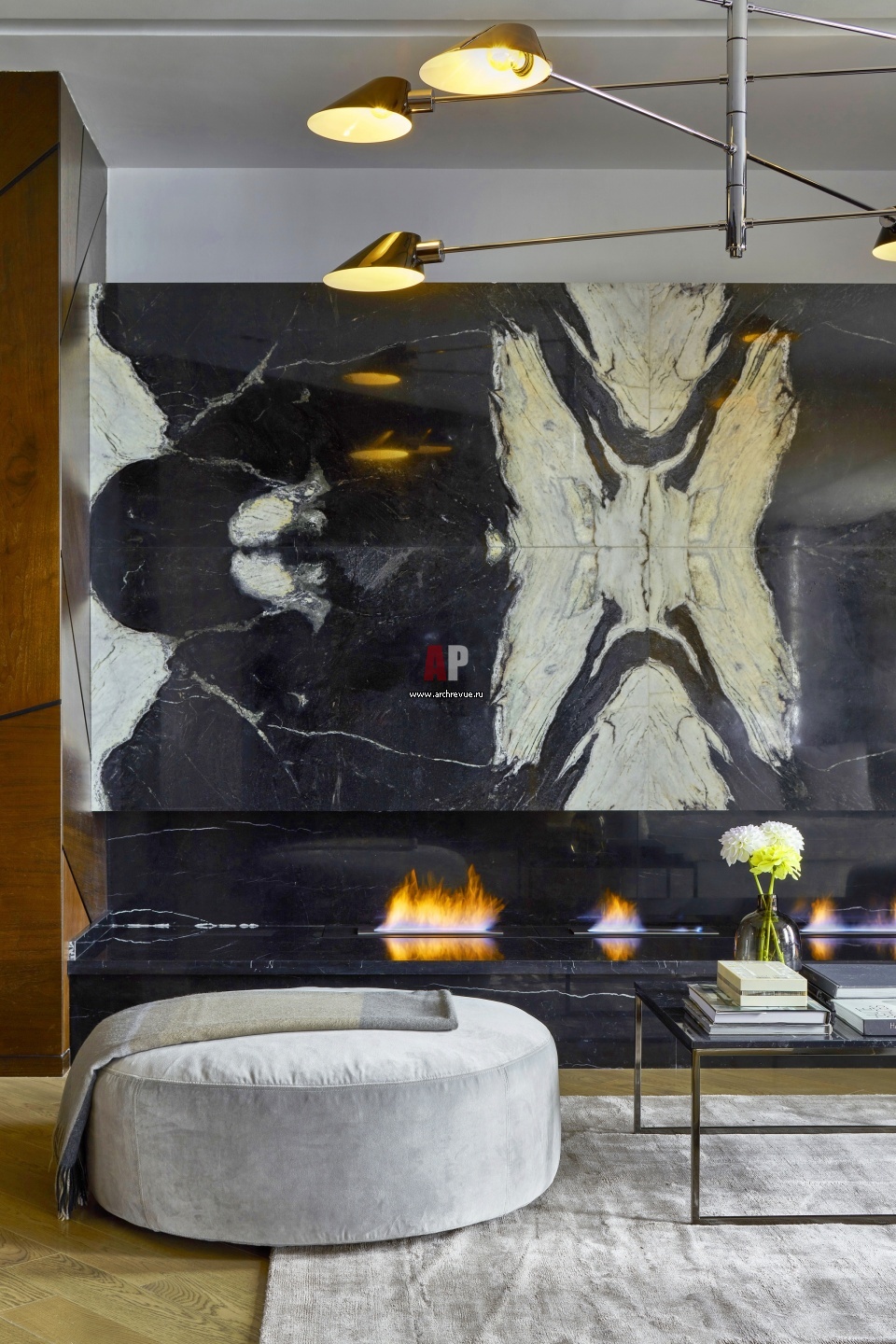 Конструкция камина в спальне была спроектирована изначально, но его облик приобрел выразительность благодаря выбору камня. Симметричная раскладка в виде крыльев бабочки визуально обогащает интерьер. Пуф и столик, Frigerio.