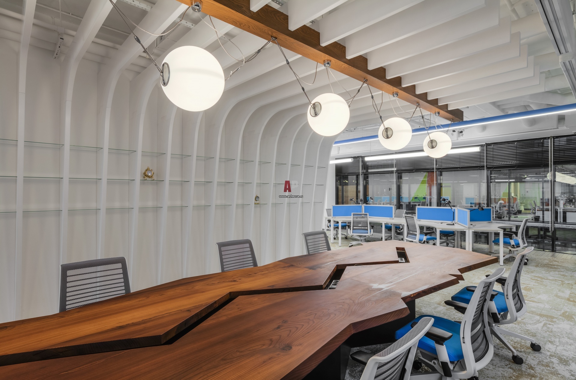 Для совместной работы проектных команд (численностью от 2 до 12 человек) архитекторы предложили множество разнообразных зон, выполненных в выбранной яхтенной стилистике.