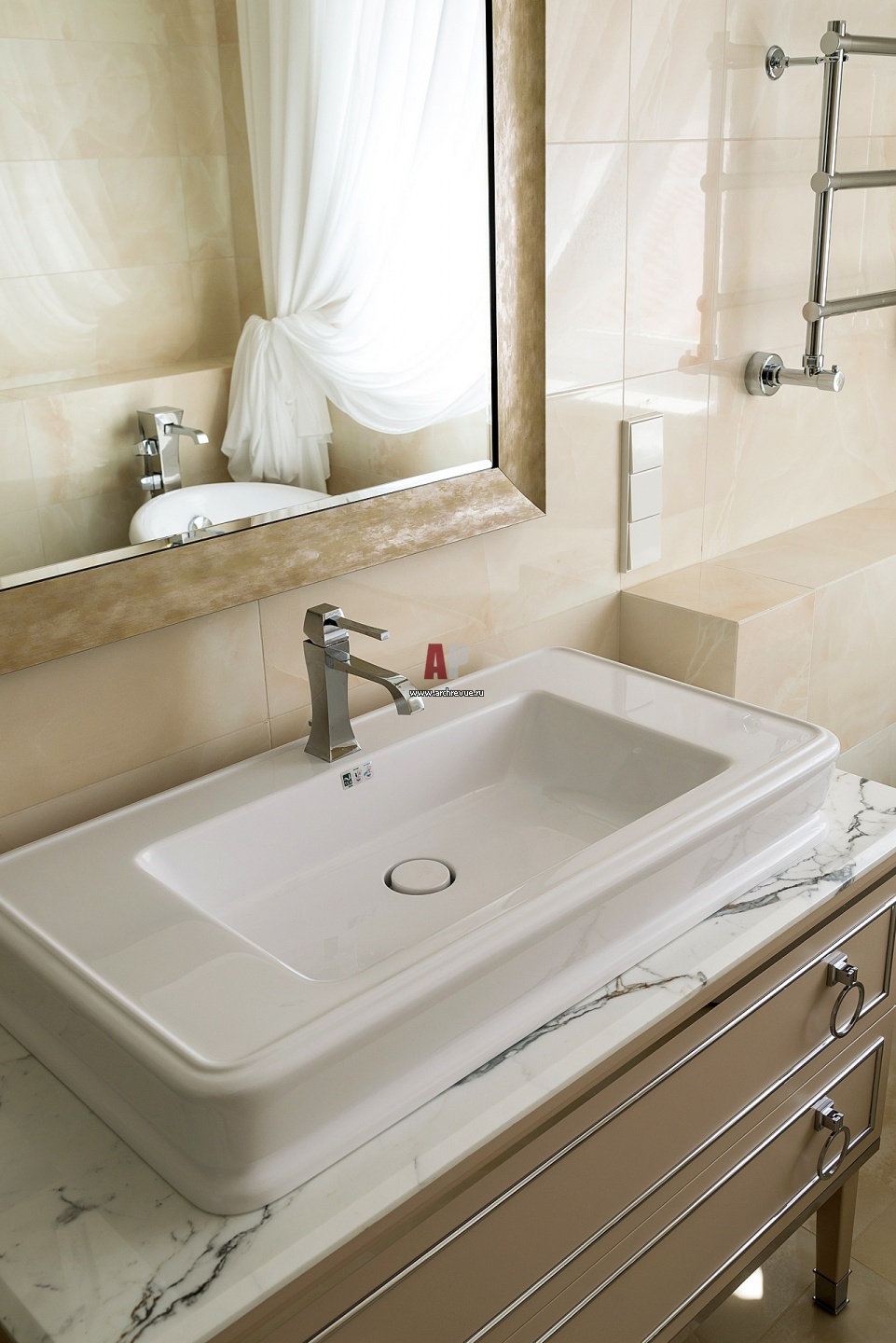 Интерьер хозяйской ванны комнаты. Умывальник, Oasis. Смеситель, Gessi.