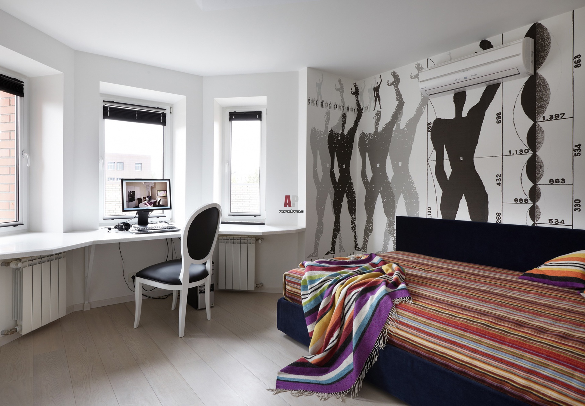 Фото интерьера детской комнаты сына-студента строительного отделения ВУЗа. В эркере организовано полноценное рабочее место. На стене – обои по эскизам архитектора Ле Корбюзье «Модулор».