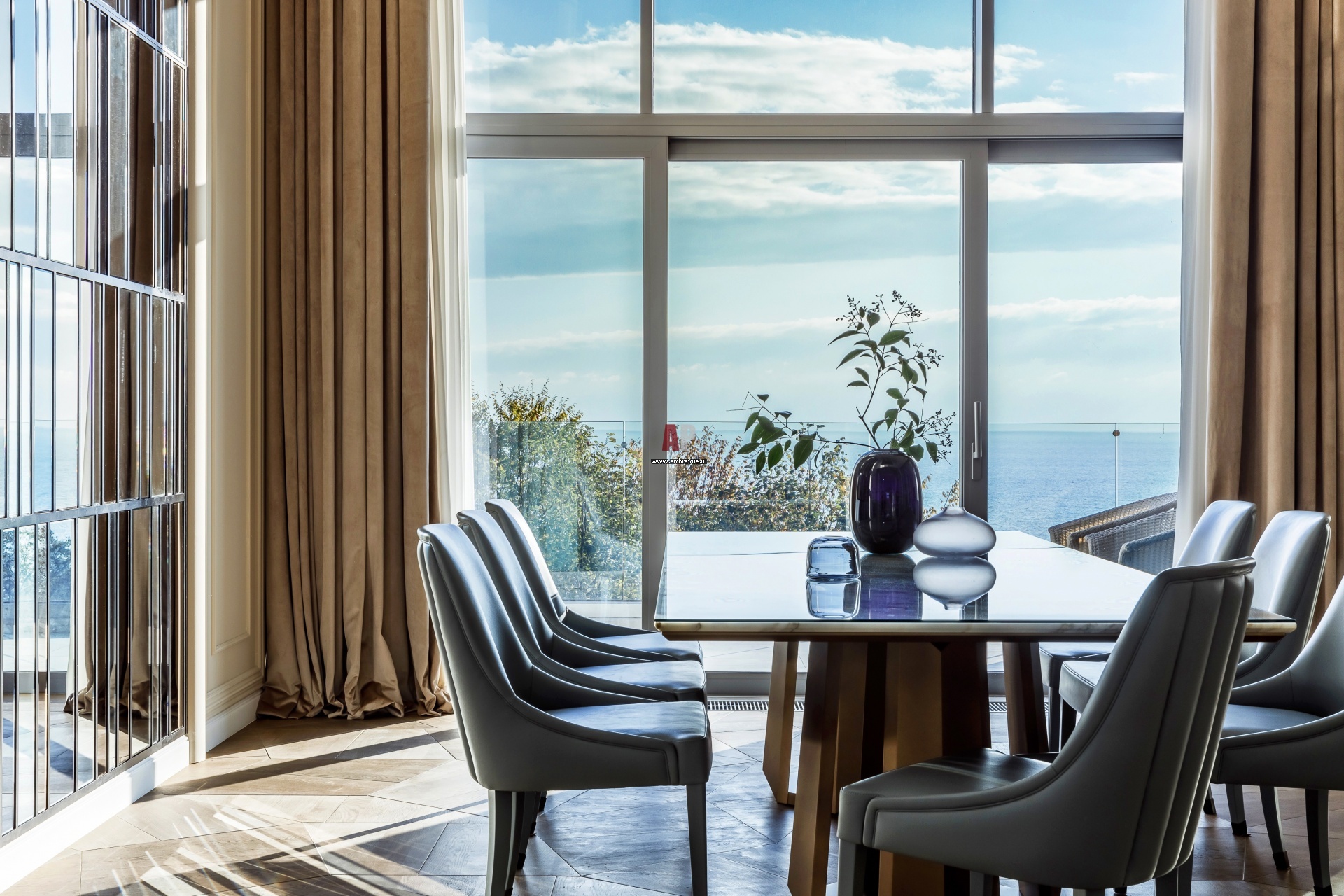 Современный семейный дом на берегу Черного моря. Интерьер столовой с панорамным окном и морским пейзажем.