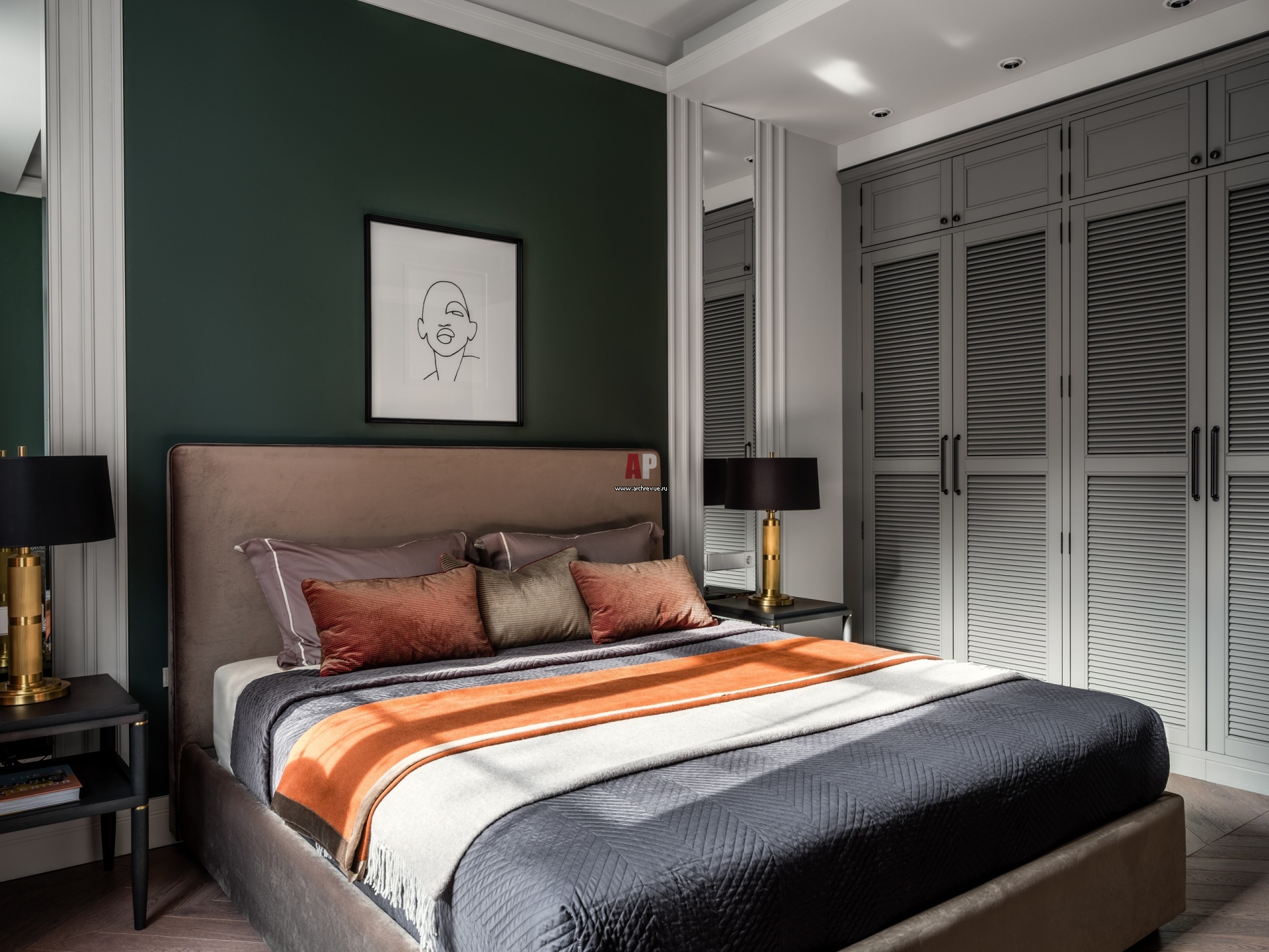 Гостевая спальня. Хозяйская и детская спальни имеют свои отдельные гардеробные при входе. В гостевой же сделан вместительный встроенный шкаф. Мебель, Dantone Home, Neptune. Светильники, Visual Comfort & Co.