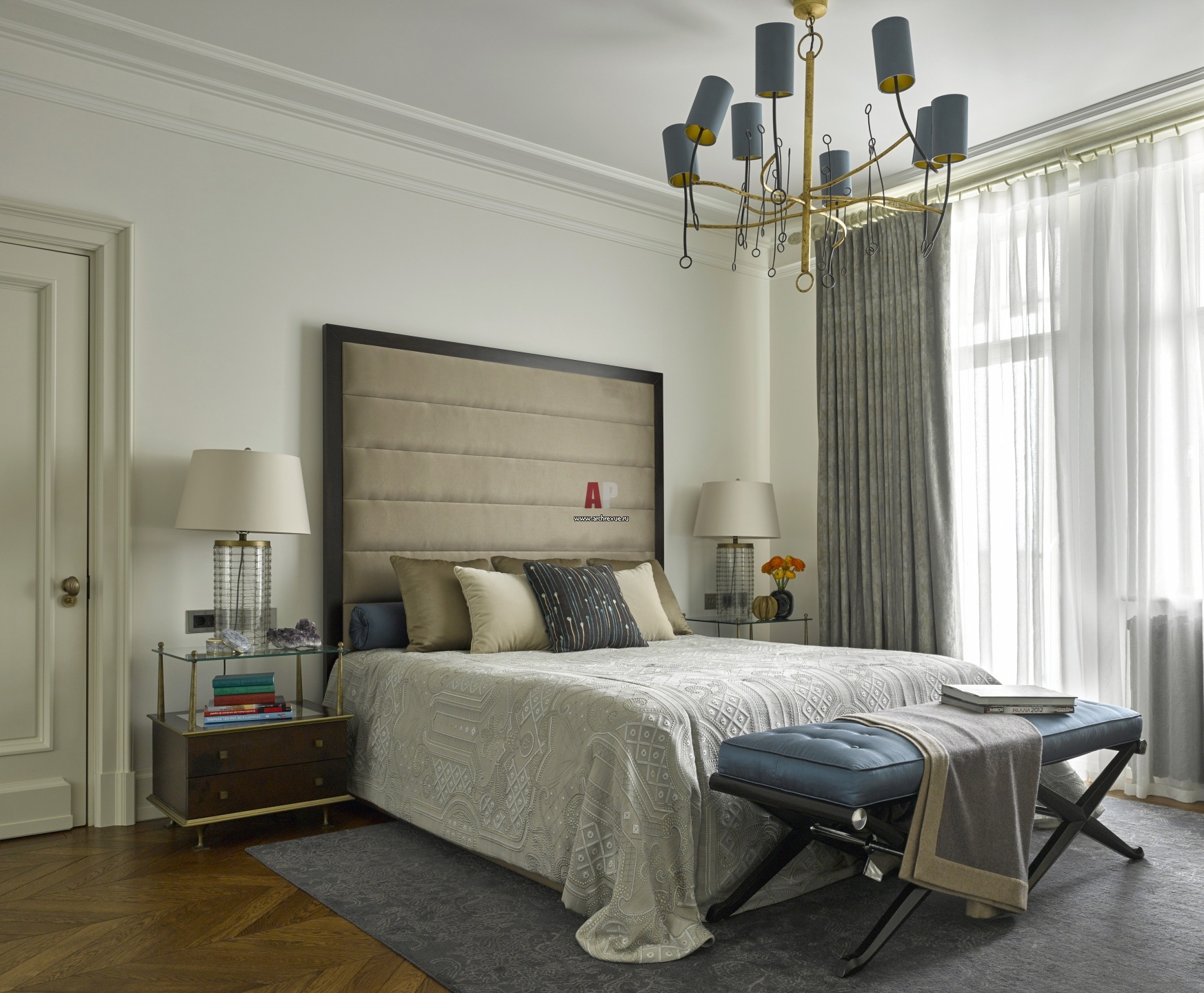 Спальня хозяев - самое строгое помещение в квартире, ее интерьер выдержан в духе неоклассики. Светильники, Porta Romana. Кровать с высоким изголовьем, The Sofa & Chair Company. Кушетка, Chaddock Home. Прикроватный столик, Julian Chichester.