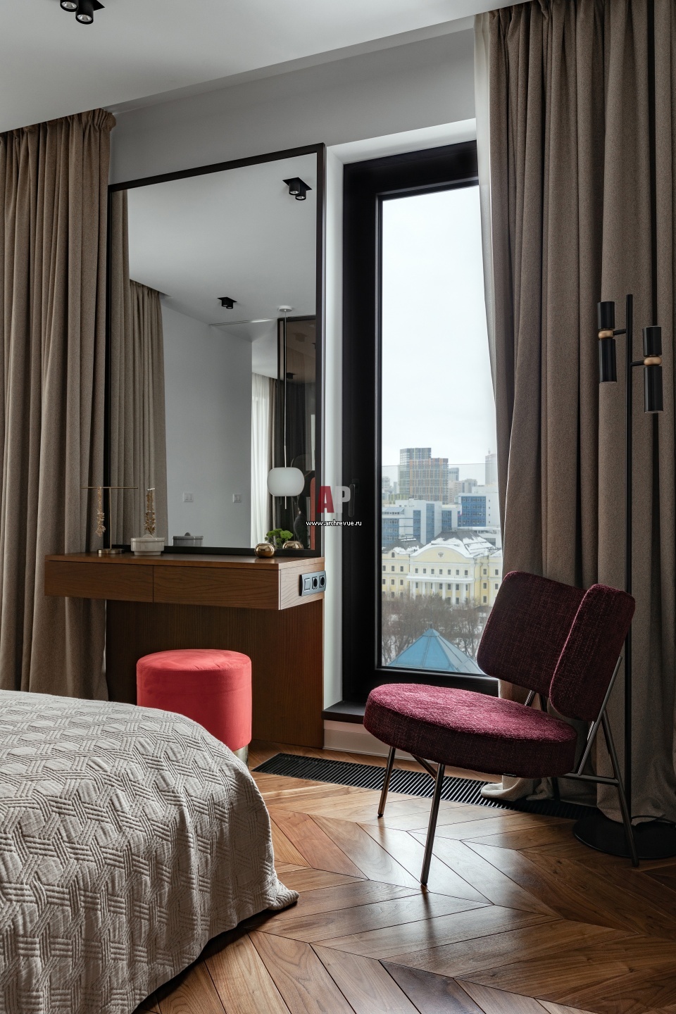 На полу в спальне уложен паркет-«елочка» из американского ореха. Туалетный столик и зеркало, на заказ. Пуф, One mebel. Торшер, Donolux. Кресло Calligaris.