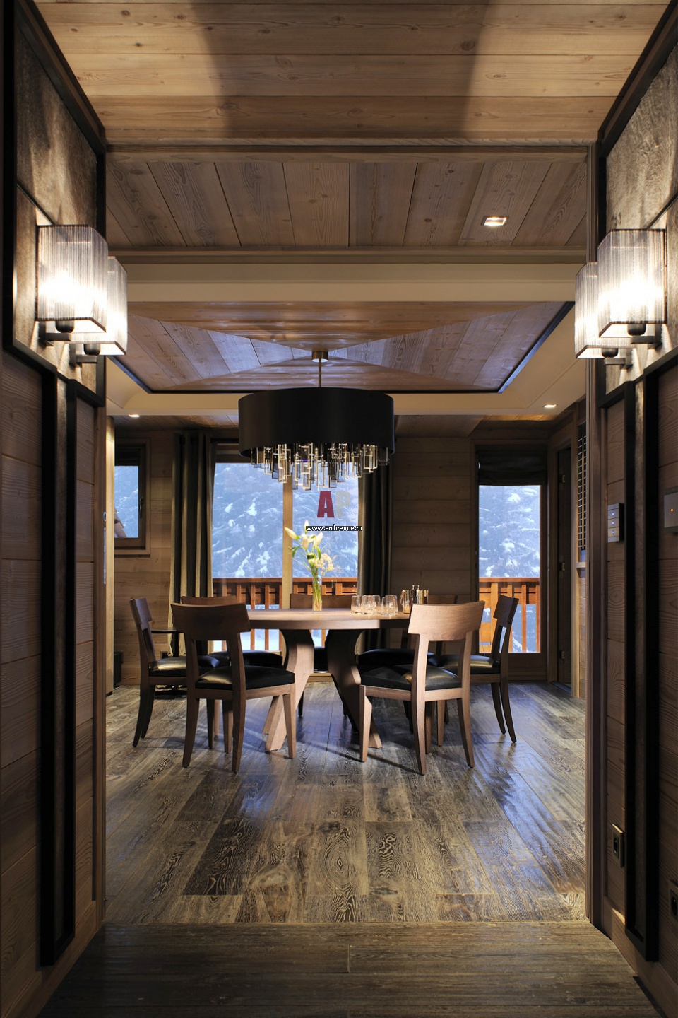 Дизайн столовой с панорамными онами и выходом на опоясывающую веранду. Обеденный стол выделен потолочными панелями из беленого дуба и массивным светильником с черным абажуром и подвесками в виде кристаллических глыб.