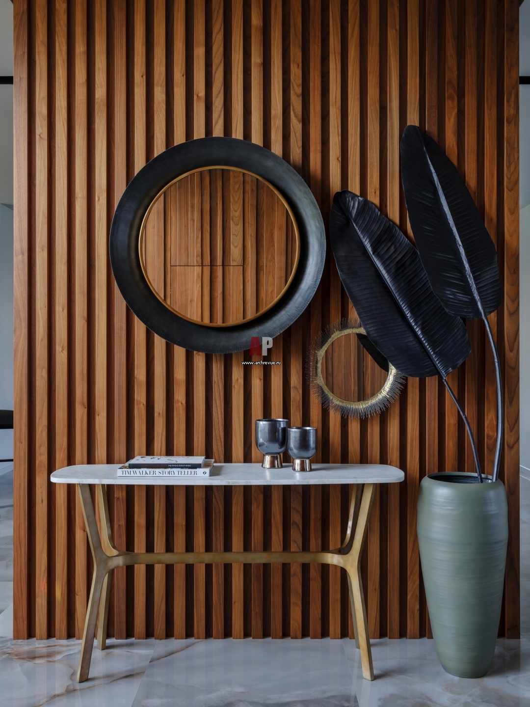 Технические помещения и вход в гараж отделен от парадной части стеновые панелями из американского ореха. Зеркало и консоль, Crate and Barrel.