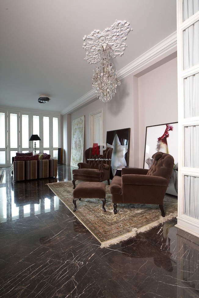 Зона отдыха в стиле фьюжн. Интерьер строится на контрасте коричневого мрамора и бежевых стен. Лепная розетка по эскизам архитектора.