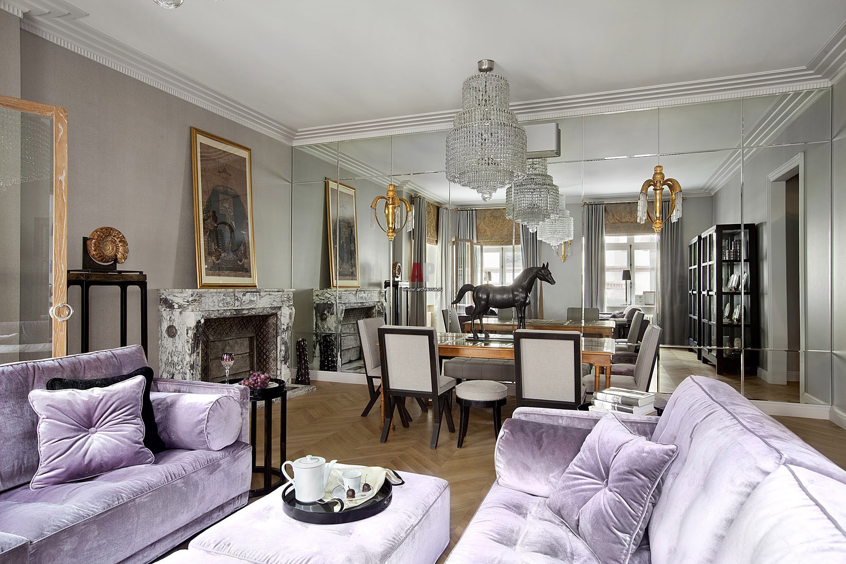 Интерьер гостиной в серебристо-жемчужных тонах. Диваны в обивке из светлого лилового бархата, Flexform. Зеркало с фальцем во всю стену. Золотые бра на зеркале – копии исторических.