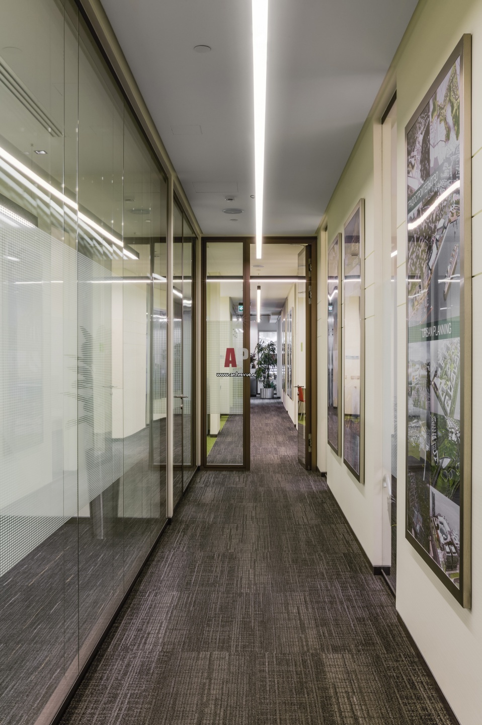 Помещения обозначены стеклянными перегородками. Применены двухслойные стеклянные перегородки с трехметровыми дверьми со скрытой фурнитурой и высокими звукоизоляционными характеристиками.