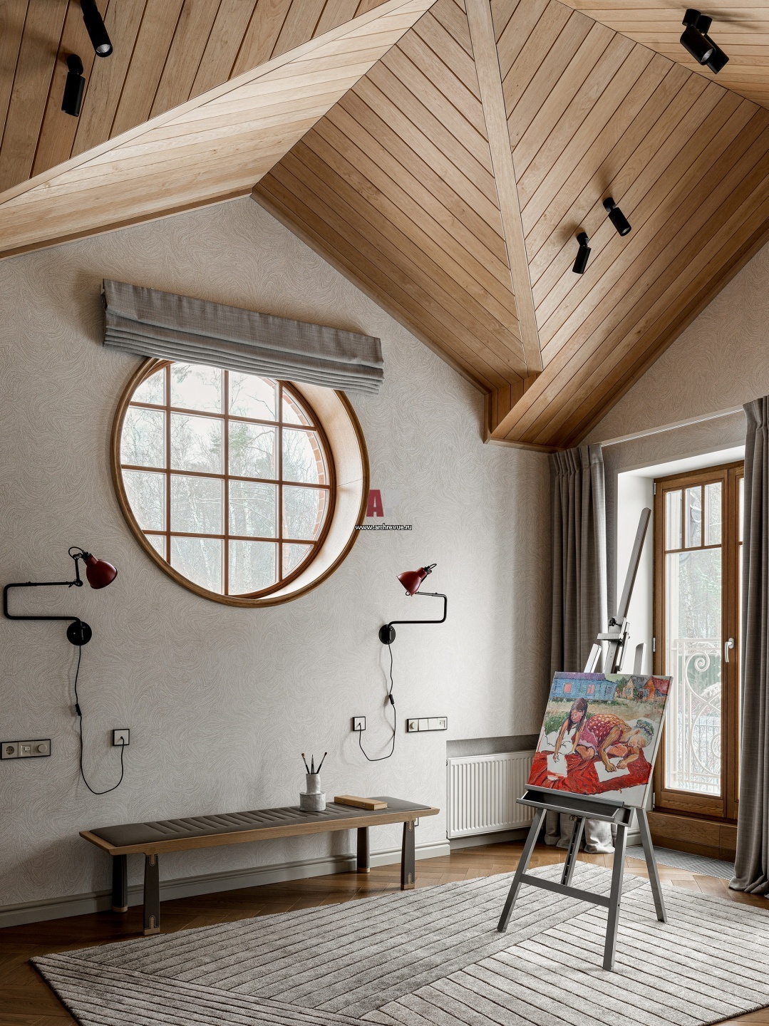 Мансардная спальня была пристроена архитекторами. Круглое окно и деревянная подшивка потолка придают ей оригинальный вид.