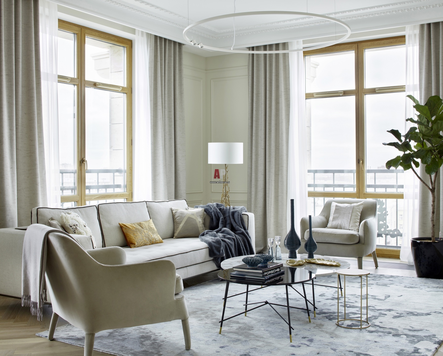 Гостиная с угловым панорамным остеклением. Деревянные окна хорошего качества достались от застройщика. Диван, кресла, Maxalto. Журнальные столики Vibieffe. Подвесной светильник-кольцо, Sattler.