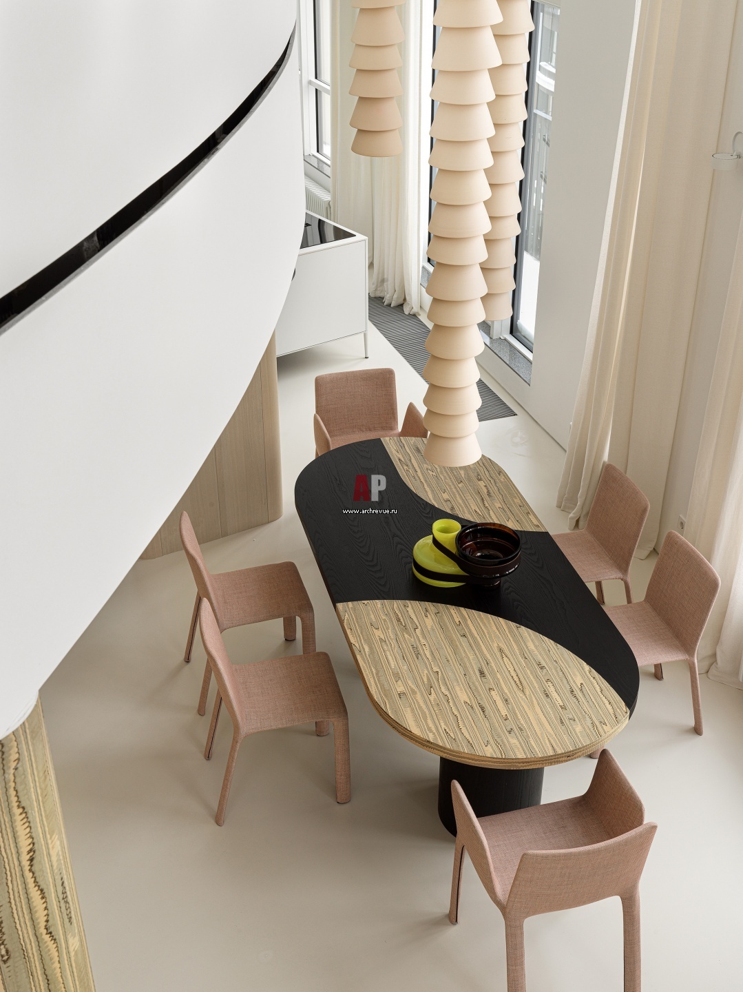 Яркий пентхаус с современным искусством в Екатеринбурге. Лестница отделяет гостиную от зоны столовой и кухни.