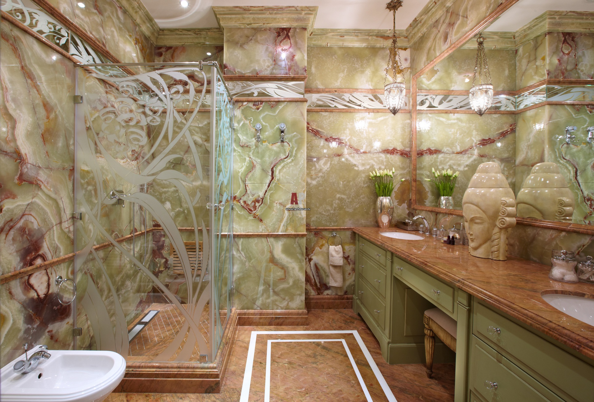 Стены и пол хозяйской ванной комнаты облицованы ониксом. Ограждение душевой кабины выполнено из прозрачного стекла с пескоструйной гравировкой.