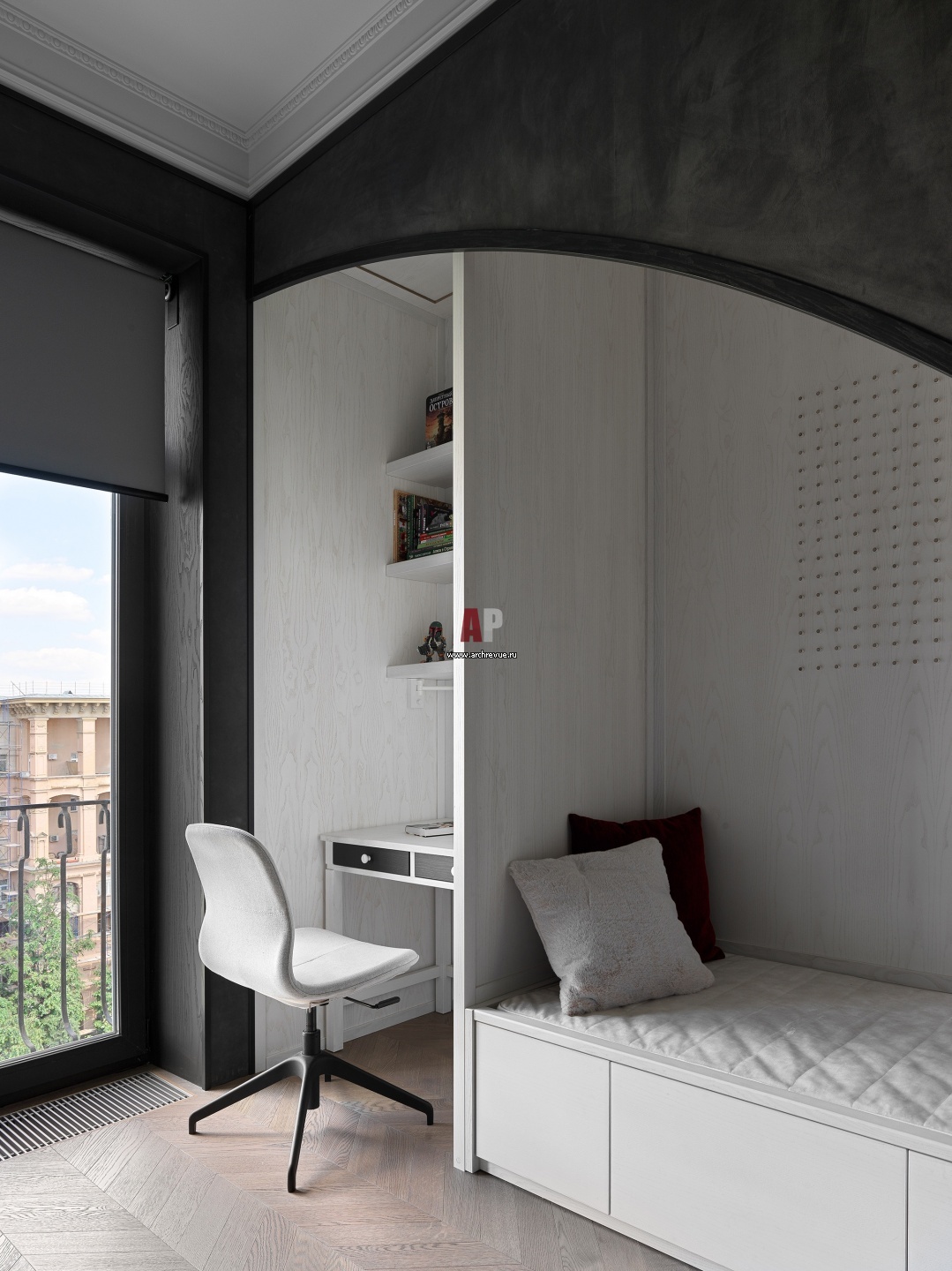 Семейная квартира в сталинском доме с видом на Сити. Интерьер детской. Перегородки в форме дуг отделаны натуральной замшей.