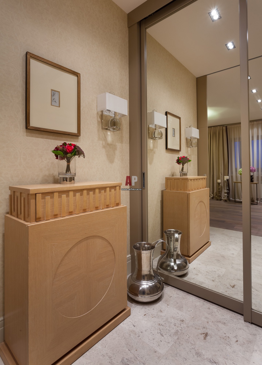 Прихожая исполнена в бежевых тонах. Встроенный шкаф для одежды с зеркальными раздвижными панелями. Пол выложен плитами из натурального доломита.