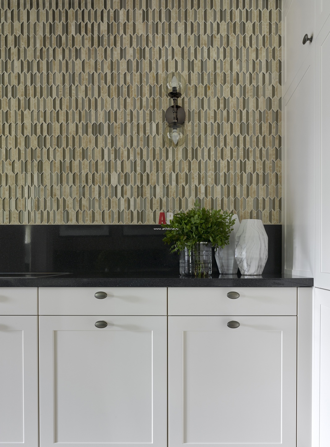 Фото интерьера кухни в пастельной цветовой гамме. Кухня, Leicht. Фартук облицован бежево-песочной мозаикой с вкраплениями природного камня и смальты, Dune.