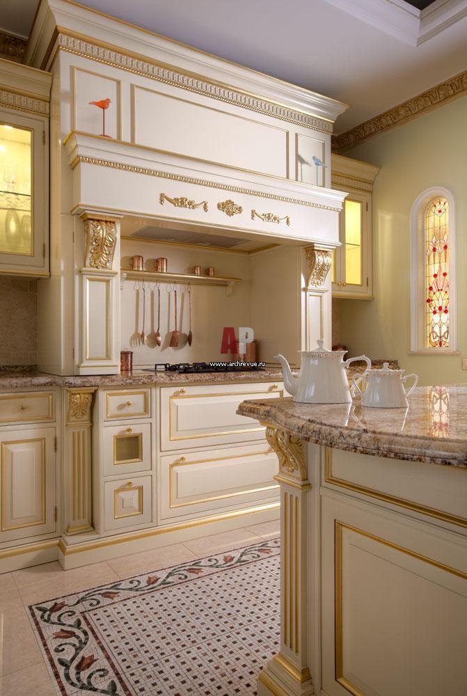 В кухне витражи и мозаичное панно на полу на цветочную тему выполнены «Мастерские художника Александра Панченко ». Фасады кухни Aldo Moletta отделаны золочением и резным узором.