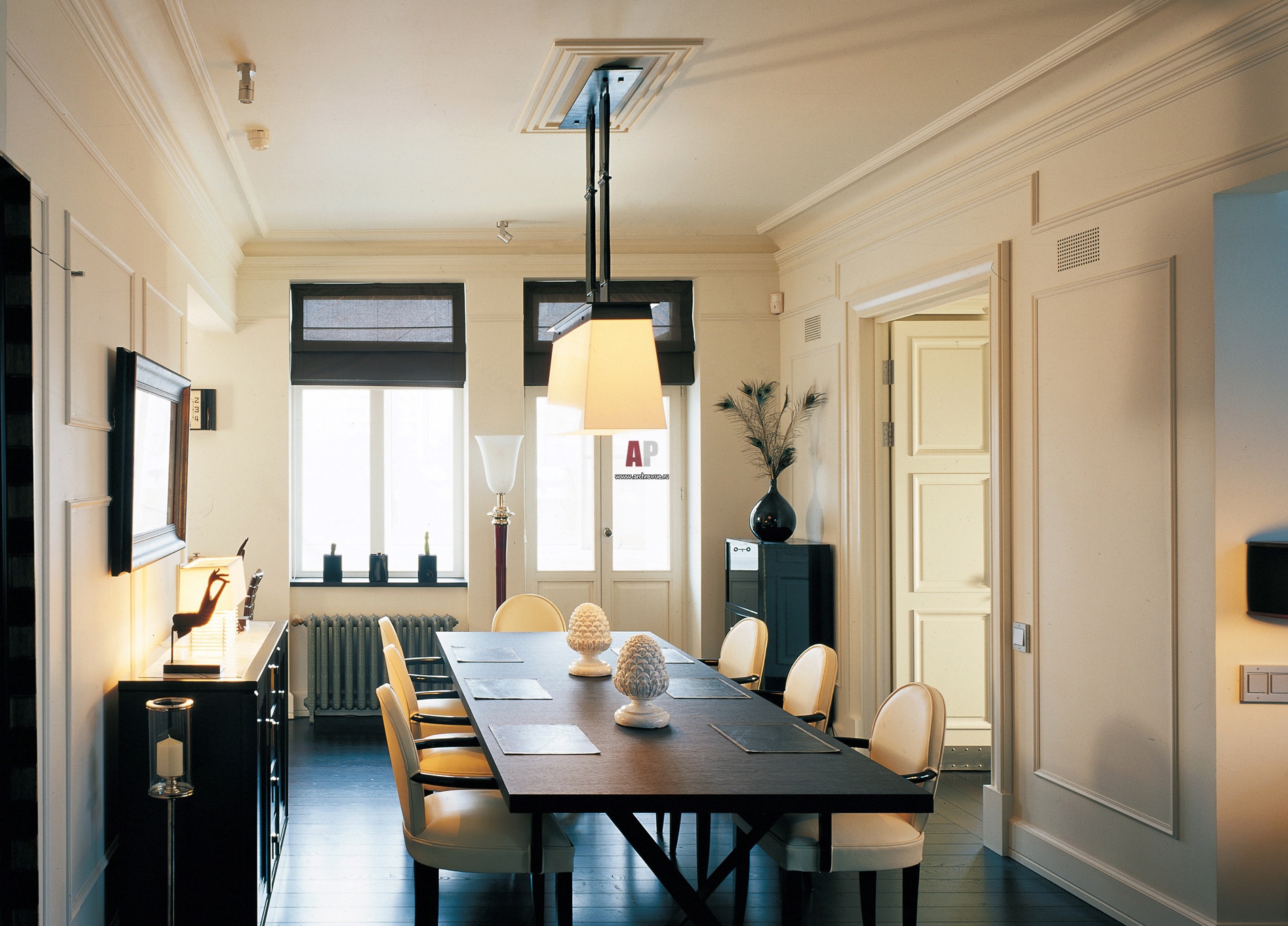 Столовая занимает центральное место в квартире. Светильник над обеденным столом сделан по эскизу А. Эрмана мастерами компании Artbronze.