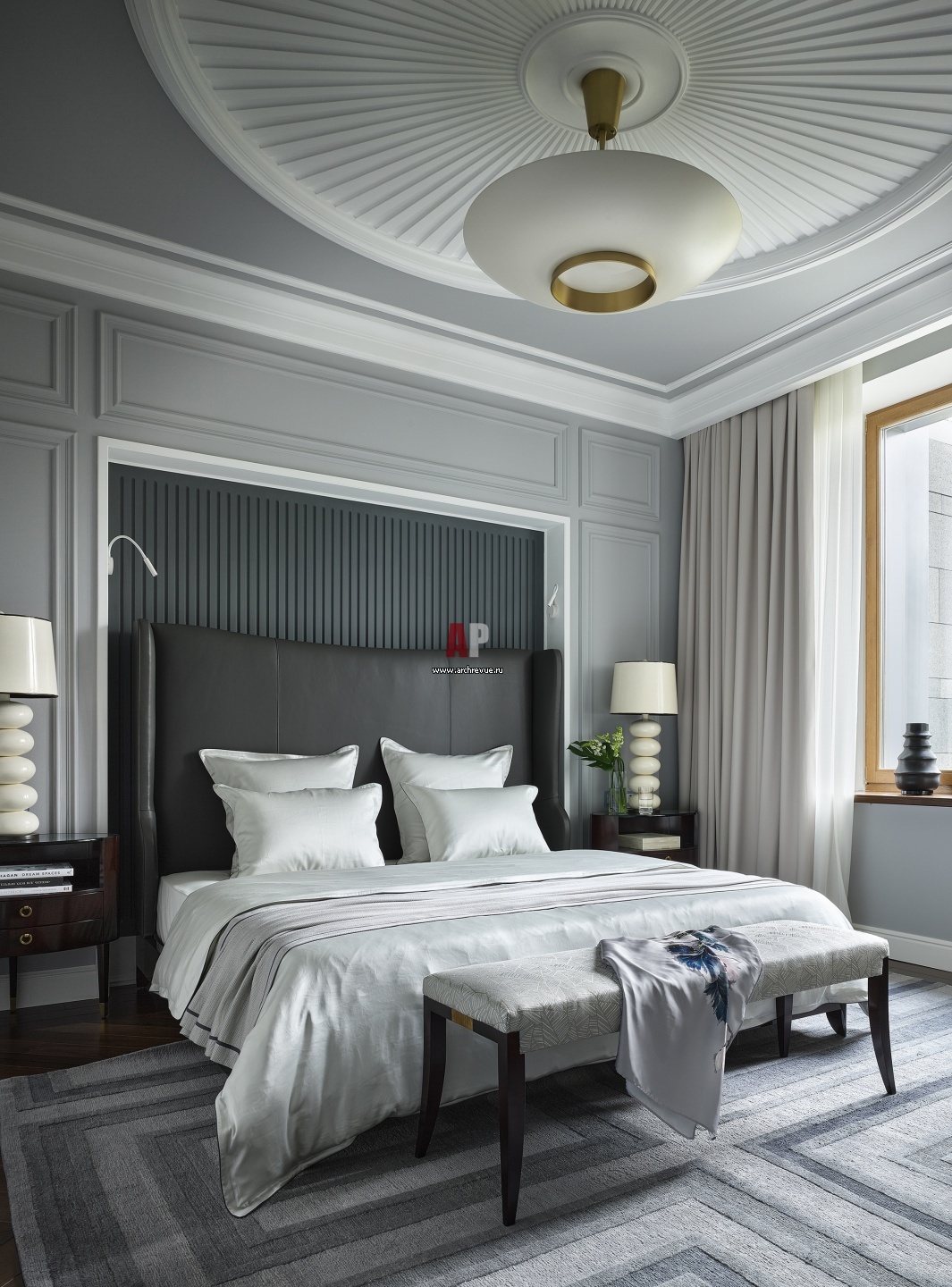 Спальня оформлена в благородных оттенках серого цвета, преобладают тактильные фактуры. Декор за изголовьем кровати, имитация драпировки на потолке выполнены из гипса. Стены, потолок, краска Benjamin Moore & Со. Кровать в отделке из кожи по дизайну Laura Kirar, тумбы по дизайну Thomas Pheasant, кушетка в шелке, акцентные настольные лампы, потолочный светильник по дизайну Barbara Barry – все Baker.