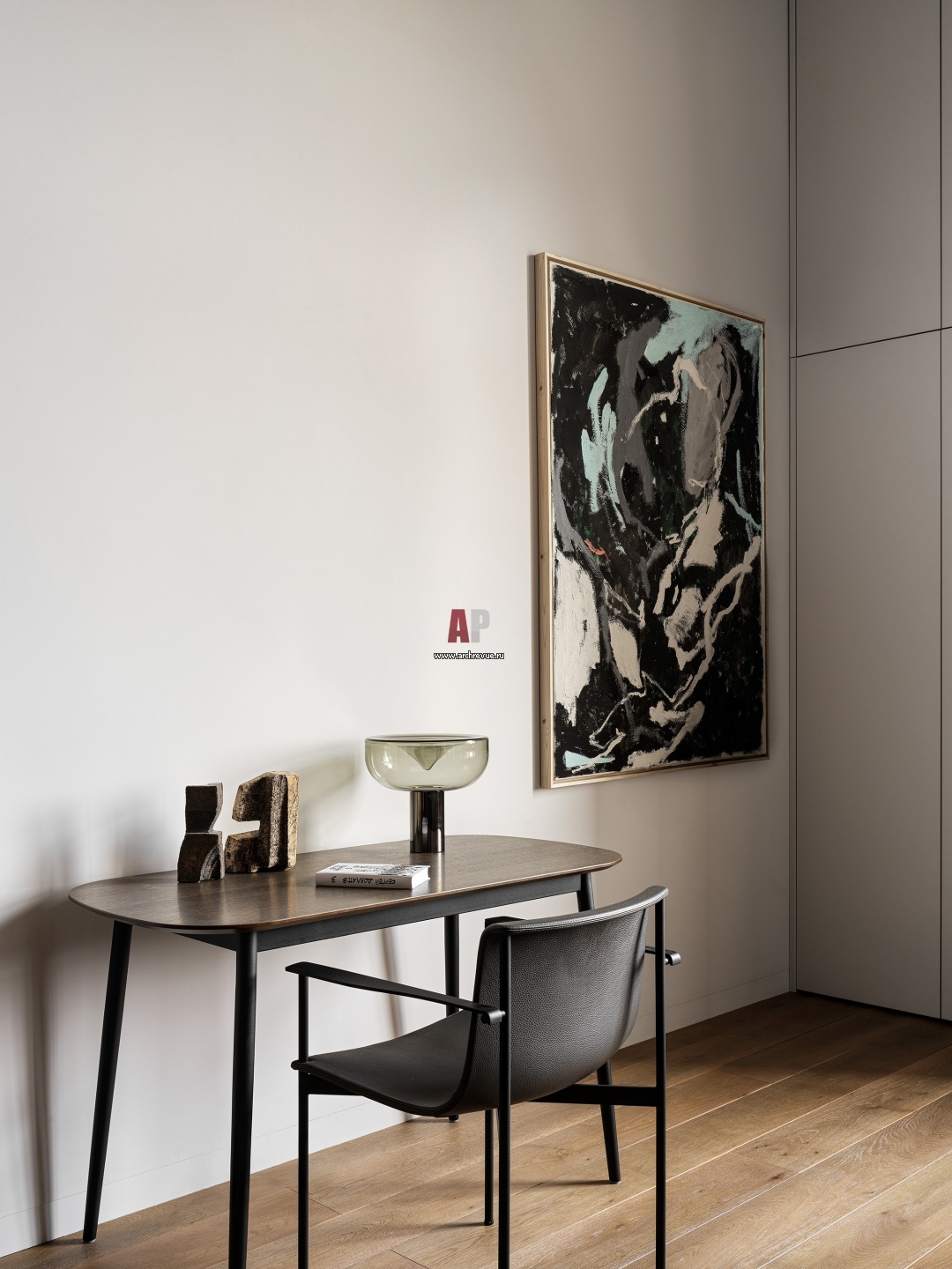 Мужская двухэтажная квартира с брутальным дизайном. Гостиная. Письменный стол, BoСoncept. Стул, Lema. Скульптуры, Константин Становов.